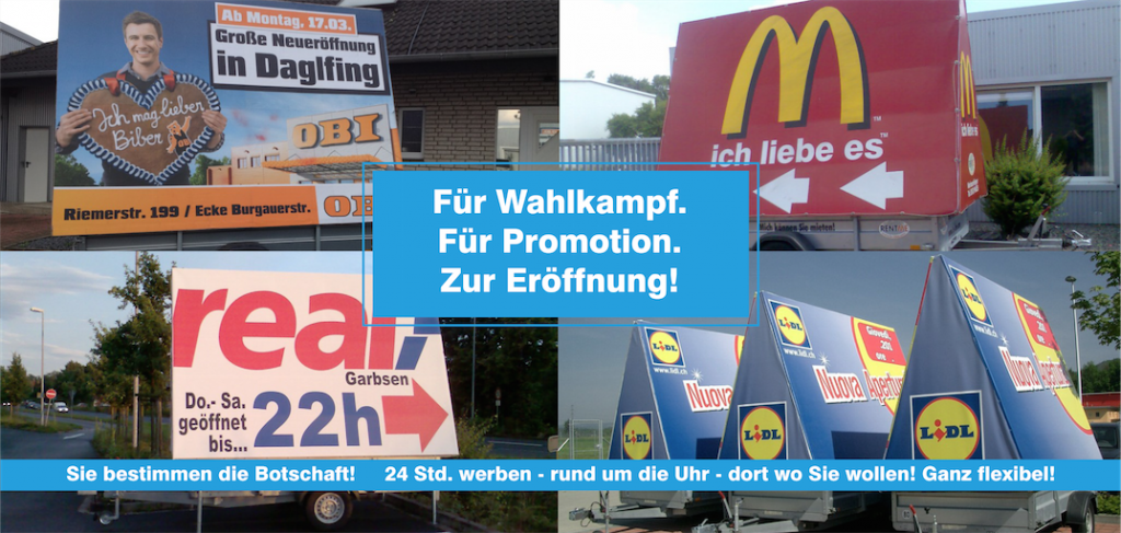 Hersteller von Werbeanhängern - Interessante Kurzzeit- und Langzeitmieten - Bundesweite Lieferung - Ideales Promotionmedium. Ausblenden